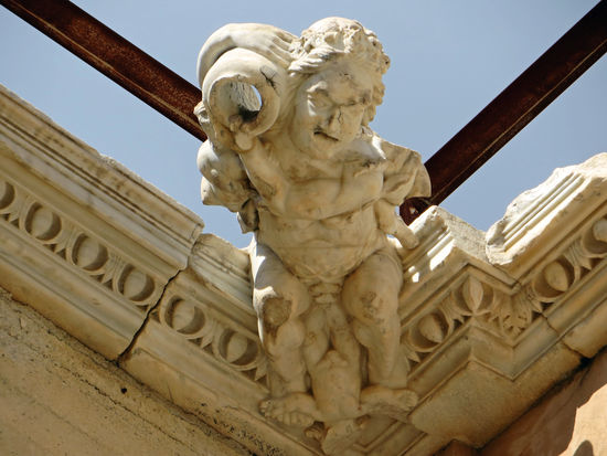 Schön ist der Zauberer, eine männliche Figur, die Sicheln in den Händen trägt und auf ihrem Kopf zwei lange geschweifte Hörner trägt.