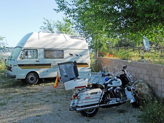 Im Schwimmbad ist viel los bei dem heißen Wetter. Und irgendwo auf dem Campingplatz scheint eine Party im Gang zu sein. Uns stört das nicht, Rolf entspannt und ich lese in einem spannenden Buch. Erst nach 22 Uhr verziehen wir uns in unseren Bus.