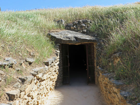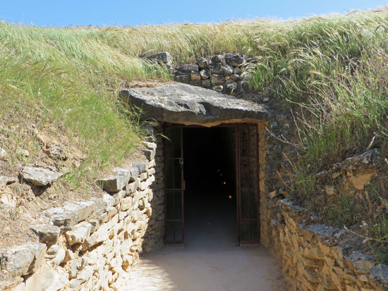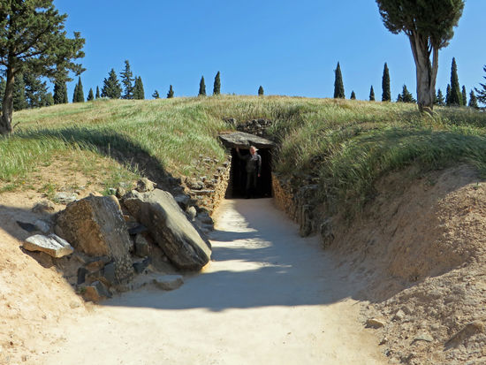 Durch die Stadt fahren wir zum Tholos de El Romeral, der etwas versteckt außerhalb der Stadt liegt und nur auf einem abenteuerlichen Sträßchen zu erreichen ist. Auch hier schauen wir zu, dass wir in Ruhe alles besichtigen, denn wir befürchten, dass wir bald nicht mehr allein sind. Und richtig, als wir am Parkplatz ankommen, stehen dort einige Autos. Einige haben ganz schöne Kratzer und Beulen.