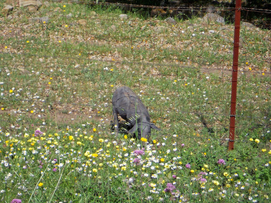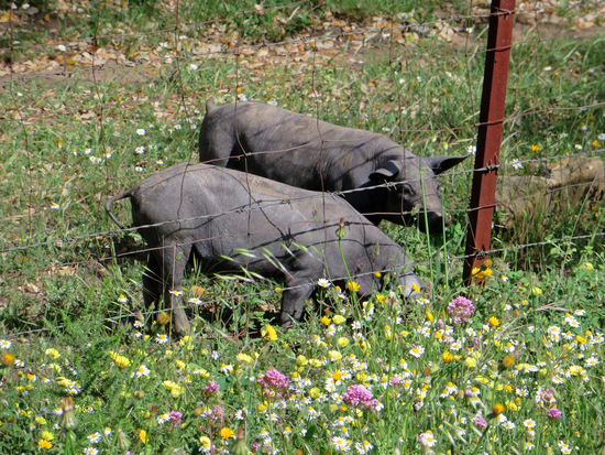 Als wir unterwegs im Naturpark in der Dehesa del Quejigal junge schwarze Schweine entdecken, gerate ich aus dem Häuschen. Rolf erbarmt sich, wir halten, steigen ab und machen einige Bilder von den glücklichen Schweinen.