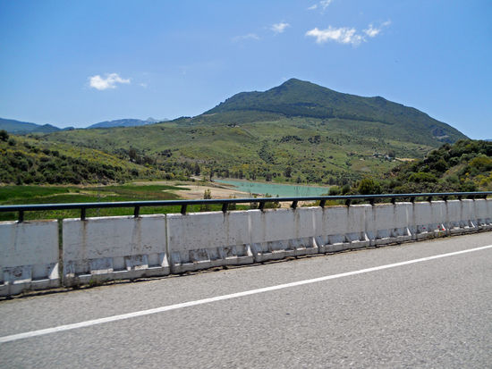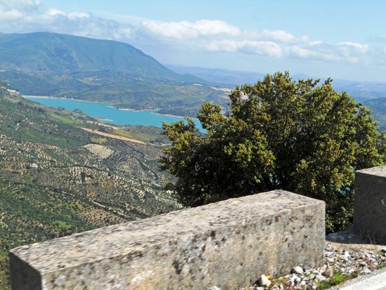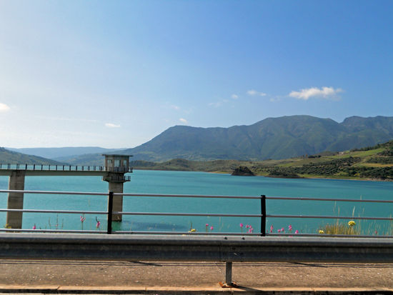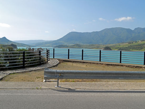 Halt oberhalb des Stausees – Embalse Zahara-El-Gastor. Das Wasser dieses Sees hat eine ungewöhnlich schöne Farbe. Ich bin total begeistert.