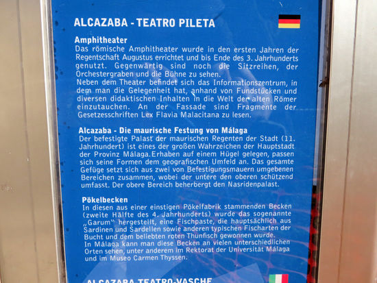 Strabon schreibt über die Stadt, dass sie ein Handelsplatz (emporium) für die Nomaden der gegenüberliegenden Küste sei und dass sie über große Anlagen zur Fabrikation von Salzfisch verfüge. Noch zu seiner Zeit trage die Stadt Züge einer phönizischen Stadt. Etwa um 83 n. Ch. unter Kaiser Domitian wurde Malaga das flavische Stadtrecht verliehen, die Lex Malacitana. Von der Bedeutung der Stadt in römischer Zeit zeugt heute noch das römische Theater unterhalb der Alcazaba.