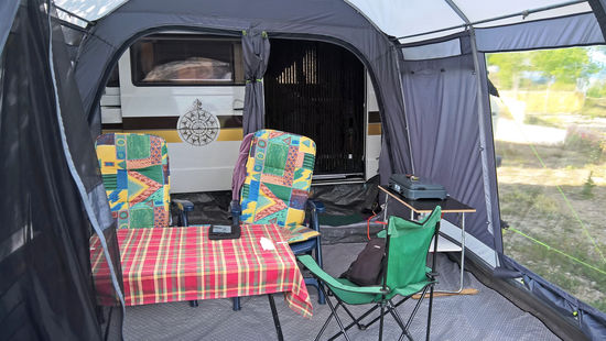 Rolf schaut im Bus Fernsehen, während ich im Zelt, welches dem Sturm und Regen gut stand hält, lese.