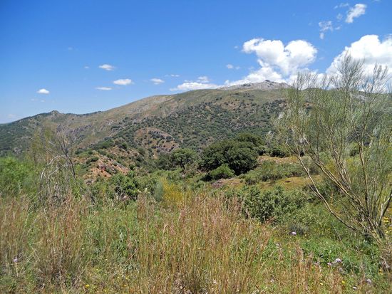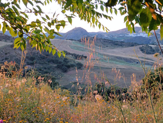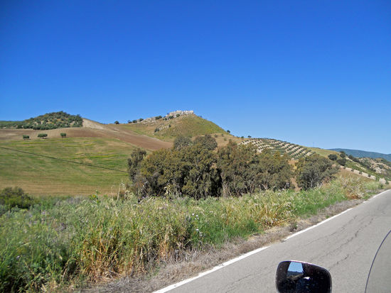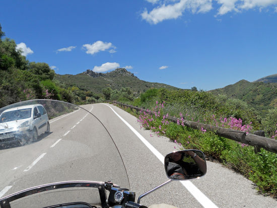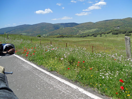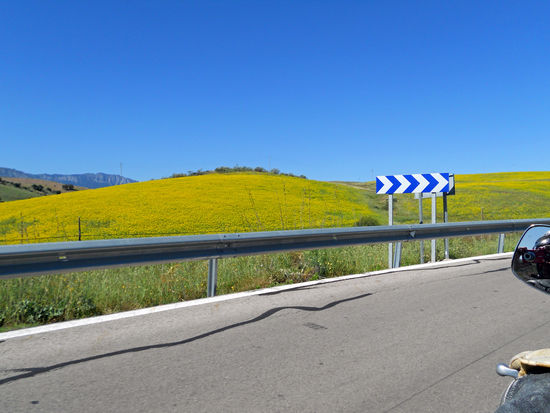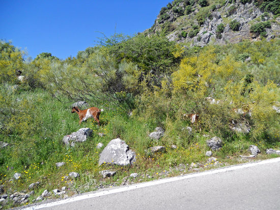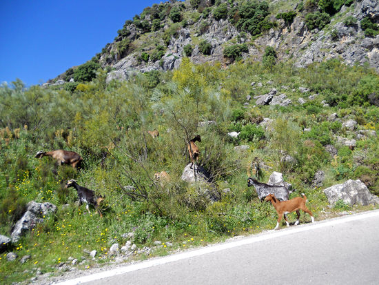 Weiter über Jimera de Libar, Montejaque, Monte Corto, Algodonales, über den Puerto de Cabanas, 540 m. Eine Ziegenherde wird vom Lärm unseres Motorrades aufgeschreckt. Sie lagern in einer Blütenwiese. Als ich sie fotografieren will, rasen sie in wilder Flucht davon. Rolf meint, sie hätten sich durch meinen Anblick erschreckt. Später steht ein braunes Pferd am Straßenrand und beäugt uns misstrauisch.