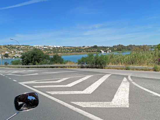 Ich bin schon fix und alle, aber Rolf will noch weiter hinauf steigen. Mir ist das zu anstrengend, bei mehr als 30 Grad. Also mache ich mich auf den Abstieg, während Rolf weiter hinauf klettert. Hier in der Altstadt dürfen in den schmalen engen Straßen nur Anwohner fahren. Ich bekäme eh die Krise, müsste ich hier Auto fahren. Von hier oben hat man allerdings einen schönen Blick auf den Rio Guadalete.