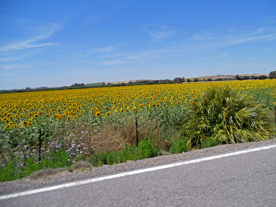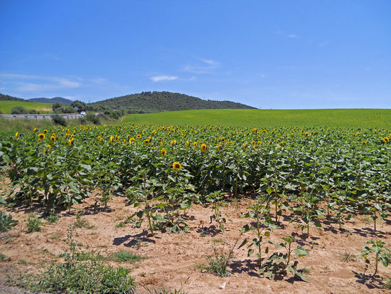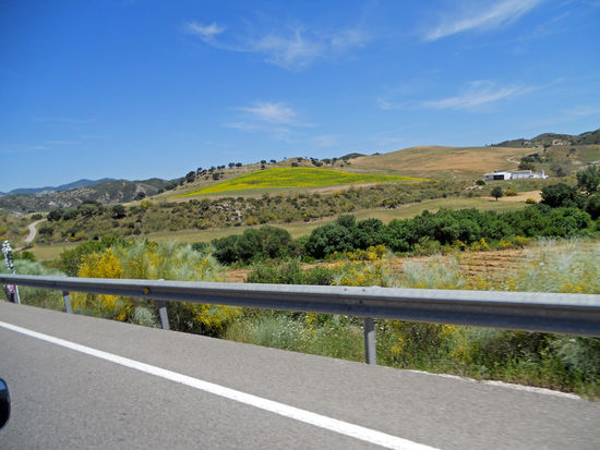 Unsere Strecke CA 6105 durch eine landschaftlich wunderschöne Gegend. Viele Sonnenblumenfelder stehen in voller Blüte, sieht herrlich aus. Vorbei an schönen gepflegten Häusern. CA 8101, A 384 Richtung Olvera.
