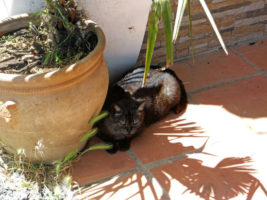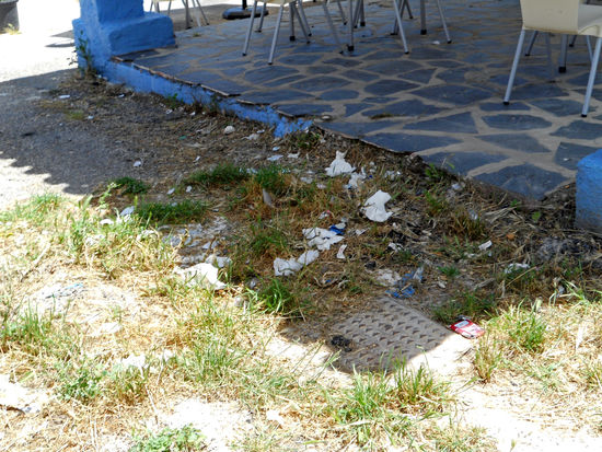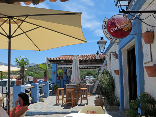 Wir wollen uns stärken und halten an der Bar La Laja. Leider merkt man hier die Nähe zur Costa del Sol – die Bar ist eine reine Touristenabzocke: 5 Sardinen 9 Euro, Brot 1,20 Euro, Bier 1,50 Euro, Wein 2 Euro. Die Terrasse der Bar und das Drumherum sind leider sehr ungepflegt. Das sind wir gar nicht gewohnt. Eine kleine Katze leistet uns Gesellschaft. Sie frisst die Innereien und die Köpfe der Sardinen.