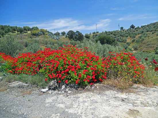 Inmitten der Wildnis, der Felder oder Olivenhainen ist immer mal wieder ein schönes weißes Haus, geschmückt mit Blumen, zu sehen. Ziegen- und Schafherden sind auch heute wieder unterwegs. Und dann die vielen herrlichen Wildblumen. Bei uns in Deutschland sieht man das kaum noch.