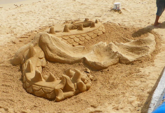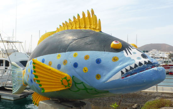Brauchbar geschlafen weckt uns eine strahlend aufgehende Sonne. Zum Frühstück ziehen zwar Wolken auf, aber sie verziehen sich im Laufe des Morgens. Wir haben beschlossen zunächst unsere Fährtickets in Carralejos zu kaufen, um am Montag nach Lanzarote zu schippern. Dort erfahren wir dann, dass es sie erst 40 min vor Abfahrt am Schalter gibt. So machen wir lediglich in der touristisch jetzt in der Vorsaison schon fast überlaufenen Stadt, einen Bummel einmal den Paseo Maritimo hinauf- und hinunter. Vor allem möchte ich ein Lokal finden, in dem es Meeresfrüchteplatte oder Paella gibt. Wir finden es und es gefällt uns gut, so dass wir am Montag versuchen werden, nach Rückkehr von der Nachbarinsel dort zu essen. Der Spaziergang bestätigt wieder einmal den Eindruck, dass es offensichtlich Leute gibt, die – weil es Urlaub ist - tiefe Einblicke in ihre z.T. unmöglichen Figuren erlauben. Fast alle Senioren – außer uns natürlich – laufen kurzhösig umher – trotz aller Krampfadegeschwader. Am kleinen Strand sind prächtige Sandburgen bzw. –figuren gebaut, schöne Fische zieren den Kai. Von der Kaimauer hat man einen guten Blick auf die Insel Lobos.