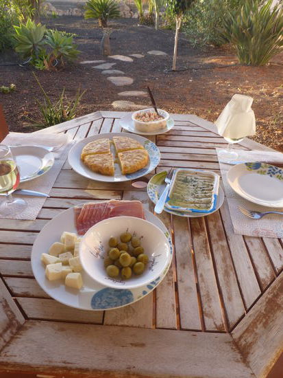 Zum Sonnenuntergang gibt es dann boquerones, tortilla espanol, ensalada rusa, jamon Serrano, Oliven und eben solchen Käse.
