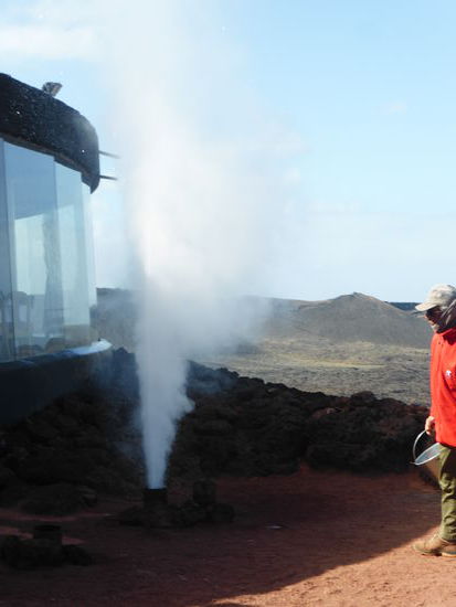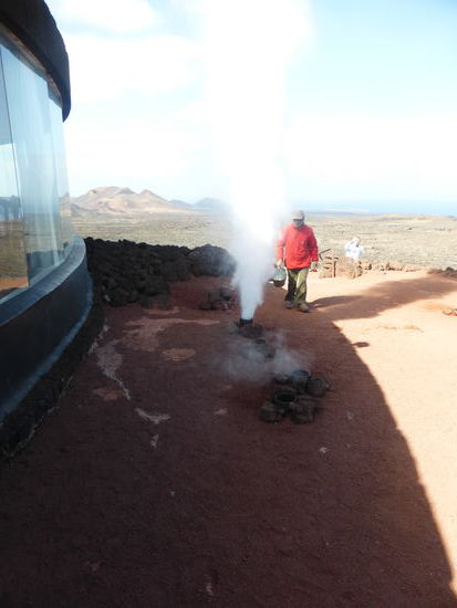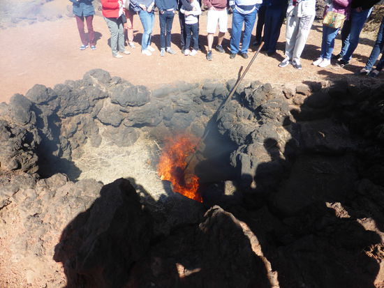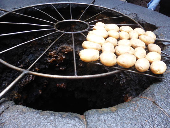 An drei Stellen gibt es noch interessante Demonstrationen: an der ersten werden Kartoffeln auf einem Rost gebraten für das Restaurant, an der zweiten gießt ein Mann Wasser in eine Röhre, das fast unmittelbar danach verpufft und schließlich an einer anderen Erdöffnung entzündet sich Stroh oder Gestrüpp (m.E. allerdings zur besseren Entzündung getränkt, denn es stinkt nach Brandbeschleuniger o.ä.).