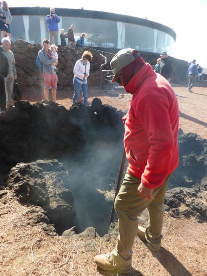 Auf Lanzarote angekommen fahren wir dann sofort zum Lavapark, wo Ulrike hinter dem Ticketschalter kein ruhiges Plätzchen zum Verschwinden findet.