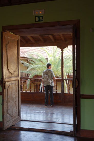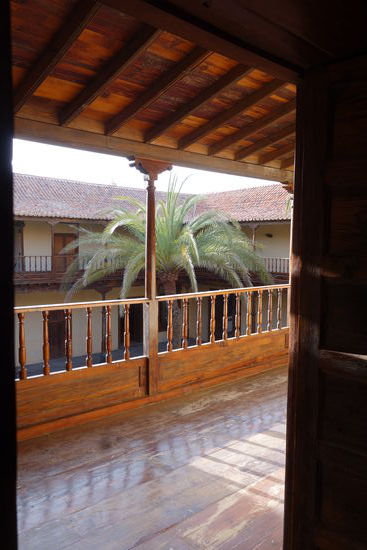Auch hier können wir besichtigen und auf der ersten Etage über eine hölzerne Galerie um den prächtigen Innenhof des unter Denkmalschutz stehenden Hauses laufen. Von oben ist ein Blick auf einen fast idealen Kegel eines alten Vulkans zu sehen.