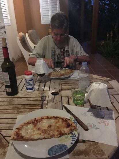 Da wir nun allmählich rechtschaffen müde sind, wollen wir zu Hause essen, dazu kaufen wir dann im Supermercado von Antigua noch eine Pizza. Auf der Terrasse gibt es Abendessen, die Rotweingläser müssen gegen Ungeziefer allerdings geschützt werden. Mangels Bierdeckeln funktioniere ich ein paar Kaffeefiltern zu Häubchen um.