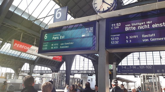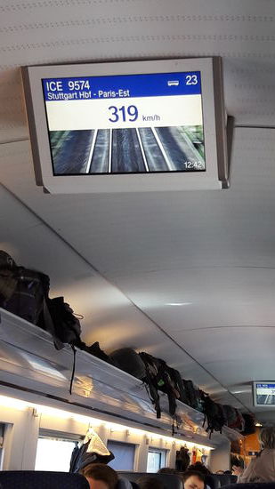 Der ICE 9574 startet in Stuttgart und daher schon gut besetzt. Auf dem Bahnsteig ist es voller als erwartet, offenbar ist die Verbindung nach Paris doch sehr beliebt. Diese Strecke wird abwechselnd von ICEs und TGVs befahren; für uns passt zeitlich nur der ICE um11:32. Es ist ein Zug der dritten ICE-Baureihe, der als Mehrsystemzug auch für den Bahnstrom außerhalb Deutschlands geeignet. Was Wikipedia nicht alles weiß.
