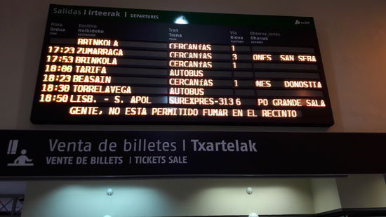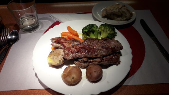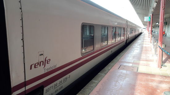 Es gibt einen Speisewagen, man sitzt auf Barhockern an einer Theke. Das Angebot am Abend ist überschaubar; es gibt ein Menü mit Vorspeise (Suppe oder Schinken), Hauptgericht (Fisch oder Fleisch), Nachtisch (bei uns gab‘s nur noch Obst), Softdrink und Kaffee. Das alles für 15 Euro, während man durch Nordspanien gefahren wird – ein reeller Gegenwert.