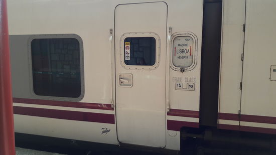 Etwa eine Stunde vor Abfahrt wird der Zug nach Lissabon bereitgestellt. Der Zug ist relativ kurz, die Waggons sind niedrig. Leider kann man durch die getönten Scheiben nur wenig vom Inneren der Wagen wahrnehmen. Einsteigen können wir noch nicht, da die Abteile noch verschlossen sind. Etwa eine halbe Stunde vor Abfahrt kommt auch das Zugpersonal, und wir können in unser Abteil.