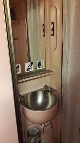 Im Innern hat der Zug mit den gewellten Wänden aus Kunststoff die Anmutung der späten 70er Jahre. Wir haben –wenn schon, denn schon – die „Grand Clase“ gebucht: Zweibettabteil mit eigener Dusche und eigenem Klo. Das Bad ist erstaunlich groß, es gibt Handtücher und einen Sanitärbeutel, wo nicht nur die übliche Seife, sondern sogar Badeschuhe und Ohrstöpsel enthalten sind. Das Abteil selbst ist dafür eher klein und eng. Es gibt zwei Sitze nebeneinander, die nachts unter dem herabgeklappten unteren Bett verschwinden. Leider gibt es so gut wie keinen Platz für Gepäck.