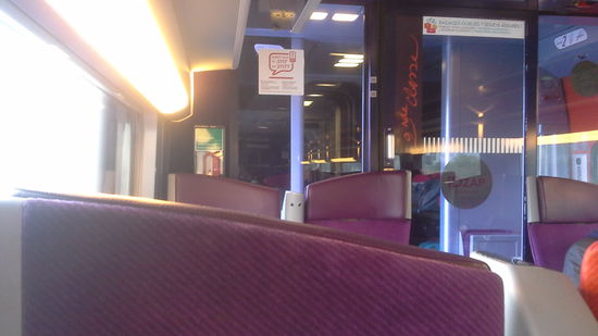 Wie schon in Paris gibt es auch hier eine Fahrkartenkontrolle am Eingang zum Bahnsteig, dabei werden die Online-Tickets elektronisch erfasst. Der angekündigte Zugchef ist auch da, und trotz Sprachbarriere – meine fehlenden Französischkenntnisse treffen auf fehlende Englischkenntnisse – ist mein Anliegen anhand der Tickets klar, und wir können ohne Kosten in den iDTVG umbuchen.