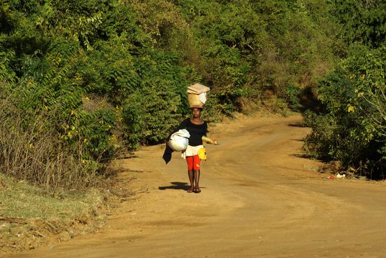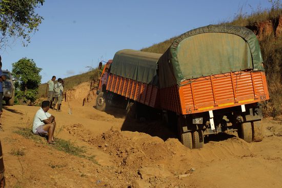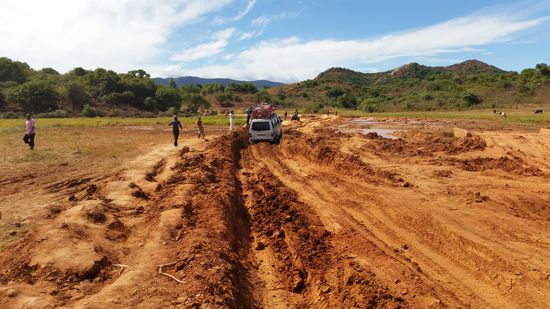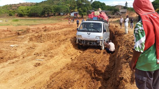 Pünktlich um 6:00 Uhr ist der Fahrer da. Ohne Frühstück machen wir uns auf den Weg. Die Piste ist staubtrocken. Tsiresy flucht hinten auf der Ladefläche, besonders bei Gegenverkehr. An einem großen Fluß finden wir einen Imbißstand. Kaffee und Bananen gibt es. Leider hat der Toyota keine Sicherheitsgurte auf den Rücksitzen. Um nicht ständig durch das Auto geschleudert zu werden muss ich mich kräftig festhalten und bekomme bald einen Krampf in der Hand. Und mit der anderen Hand den Haltegriff festzuhalten geht ganz schön auf das Schultergelenk. Mittagessen wieder in Daraina. Irgendwann verlassen mich die Kräfte und ich hüpfe dösend als Gummiball im Auto rum. Plötzlich ist Schluß. Ein LKW mit Anhänger hat sich festgefahren und blockiert die Piste. Einige Männer schaufeln das Ungetüm aus, andere schütten tiefe Schlaglöcher neben dem LKW zu, um eine Umfahrung zu ermöglichen. Mittlerweile hat sich eine lange Schlange an Geländewägen gebildet, ein VW Touareg dreht seine Soundanlage auf und die Stimmung ist super. Es wird gelacht und getanzt, einer drückt mir eine Flasche Rum in die Hand. Ist ja beinahe wie in Deutschland. Aber halt nicht ganz.
