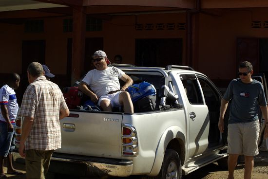 Wir schlachten das Nutellaglas und freuen uns, dass der Fahrer schon um 9 Uhr da ist. Das Gepäck verstauen wir hinten auf der Ladefläche und bauen in der Mitte eine Kule, in die sich Tsiresy reinsetzen kann. Als der Fahrer das Geld bekommt, ist er sofort von einigen Herren umgeben, bei denen er wohl Schulden hat. Se alle bekommen etwas ab. Dann geht es zur Gemeindeverwaltung, wo er erst mal eine Versicherung für das Fahrzeug abschließt und dann braucht er noch eine Genehmigung, um Touristen zu fahren. Von Stunde zu Stunde sinkt unsere Stimmung. Gegen 12 Uhr hat er alle Papiere zusammen und wir fahren zu seinem Haus, wo er seinen Rucksack abholt. Endlich können wir los, erst mal zur Tankstelle. Dann erwartet uns die holperigste Piste, die wir jemals gefahren sind. Unvorstellbar. Vom ersten Kilometer an anspruchsvoll zu fahren, nach wenigen Minuten sind die Trittbretter gebrochen. Wir schaukeln durch Steppe und Urwald, Berge rauf und runter. Riesige Quartzadern durchziehen die Landschaft. Ich plane mit Eberhard, die Steinbrocken zuzuschneiden und ein Haus ganz aus diesen transparenten Bergkristallen zu bauen. Das leuchtet dann in der Nacht, wenn innen das Licht brennt. Es geht an umgekippten Lastwägen und im Schlamm steckengebliebenen Kleinbussen vorbei. Nirgendwo ein Bauarbeiter, der die Piste irgendwie zu reparieren versuchen würde. Wildnis, kleine Dörfer und rote Piste. Einfach schön. Zum Lunch gibt's Zebu mit Reis. In 6 Stunden schaffen wir gerade mal 70 Kilometer. Noch 30 Kilometer in der Dunkelheit, dann erreichen wir das Dorf Daraina, ziemlich verloren im Outback. Das einzige weißen Touristen halbwegs zumutbare Hotel "Le Lemurien blanc" ist ausgebucht. In einem kleinen Restaurant essen wir Zebu mit Reis und warten. Tsiresy organisiert ein Quartier. Eine Wellblechhütte mit 4 durch Holzbretter abgeteilten Zimmerchen, in jedem ein Bett. Michael teilt sich mit Tsiresy das Zimmer. Beim Anblick des Sanitärbereiches würden meine Damen vermutlich schreiend das Weite suchen: Die einzige Toilette für "Hotel"-Gäste, Restaurantgäste und Angestellte ist ein Hockklo ohne Wasser in einer kleinen verrosteten Wellblechbaracke. Immerhin gibt es zwei Duschen, oder besser gesagt Kämmerchen, in denen ein Eimer Wasser und ein Becher zum drüberkippen stehen. Na dann mal Gute Nacht.