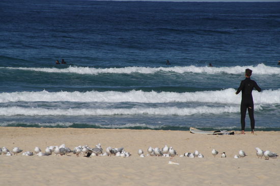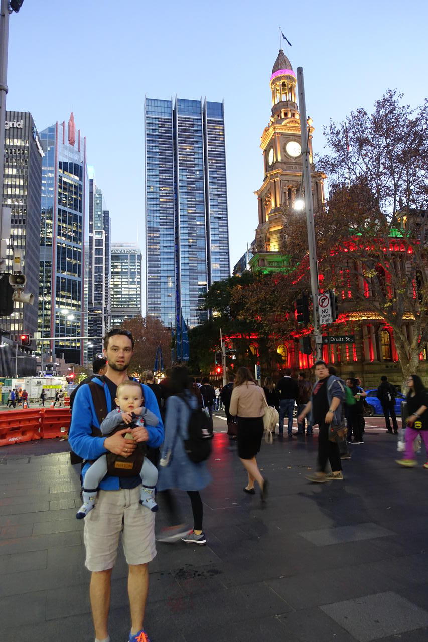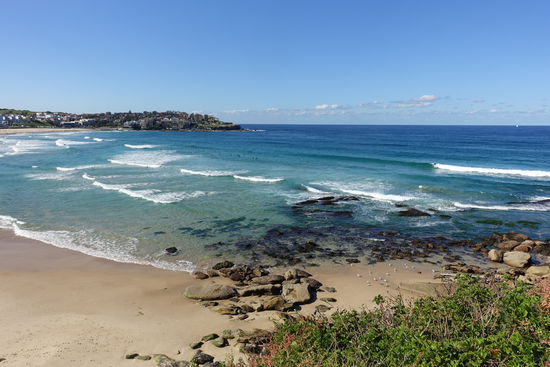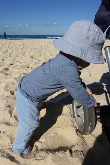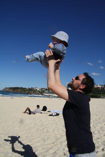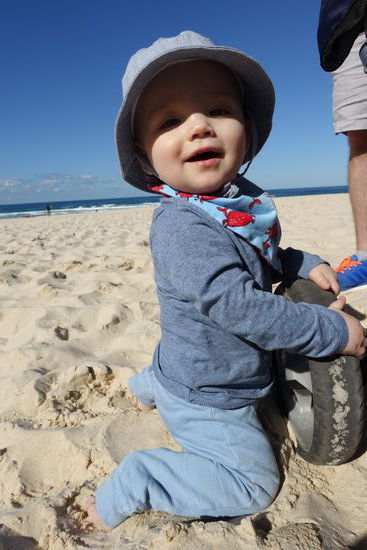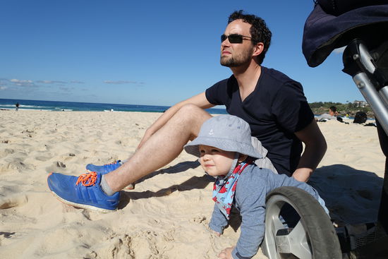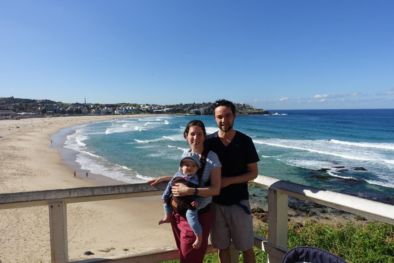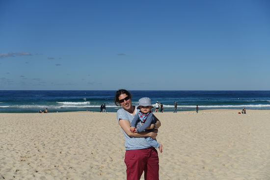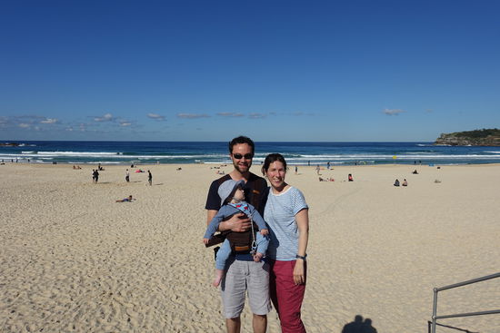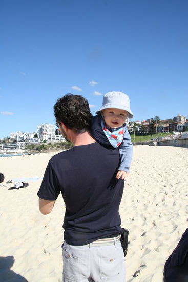 Nachdem wir nun wieder Großstadtluft geschnuppert hatten, wollten wir heute noch mal einen entspannten Tag an Sydneys Strandvororten verbringen. Start war Bondi Beach, der weltberühmte Surfstrand. Ich hatte von meiner letzten Australienreise in Erinnerung, dass der Coastalwalk, der die verschiedenen Orte miteinander verbindet, sehr schön ist. Leider hatte ich nicht in Erinnerung, dass der Weg absolut ungeeignet für einen Kinderwagen ist. Zu viele Treppen kamen da auf uns zu, so dass wir diesen Programmpunkt streichen mussten. Dafür hatten wir nach dem Mittagessen Zeit in Sydney noch zwei weitere Viertel anzuschauen. Für Emil wurden in dem kleinen Café/Bistro extra ein Schälchen Nudeln gekocht, nachdem wir gemeinsam mit der Besitzerin überlegt hatten, was ein Baby von der Karte gut essen könne. Letztendlich schmeckte ihm mein Kürbissandwich ( 2 Körnerbaguettehälften, mit Käse und gekochten Kürbisstücken und Babyspinat) doch besser, als seine Nudeln mit Butter und Parmesan. Wir haben uns erst gar nicht getraut, ihm " sein" Babygericht aus dem Gläschen anzubieten