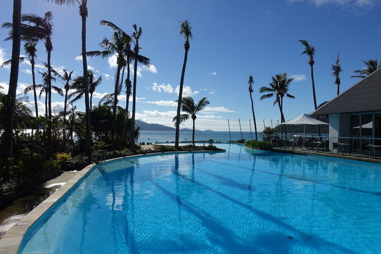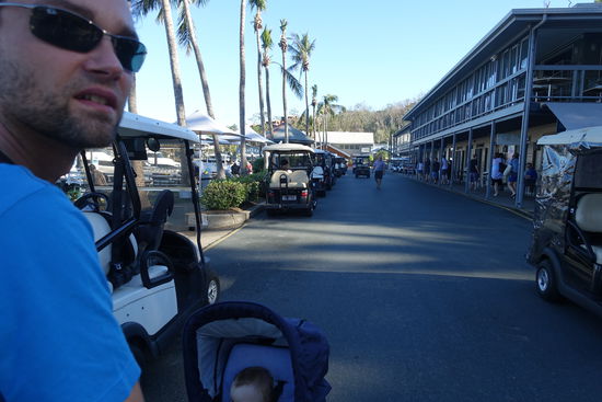 Nach dem Schlechtwettertag in den Whitsundays wurden wir am nächsten Tag auf Hamilton Island etwas entschädigt. Hierfür buchten wir eigentlich nur ein Fährticket, um im Herzen der Whitsundays zu landen. Ein großer Katamaran brachte uns um 08:00 auf einer einstündigen Fahrt auf die Insel. Der Ausstieg versprach schon einen tollen Tag. So wie wir es lieben und z. B. von den Kykladen kannten, stiegen wir an einem kleinen Hafen aus. Um uns herum, die kleinen und großen Boote, die im Hafen hin und her schaukelten. Man hatte sofort ein Gefühl der Entschleunigung, obwohl die Insel als Resortinsel touristisch schon sehr erschlossen ist. Das erste was wir sahen, waren Touristen, die in kleinen Buggys über die Insel flitzen. Teilweise auch mit Kindersitzen. Ansonsten kann man sich als Fußgänger mit dem Shuttlebus zwischen Frontstreet und dem über den Berg gelegenen Strand fahren lassen. Am Strand befindet sich ein großes Resort, das anscheinend auch für die Tagesgäste zugänglich ist. Mit großer Poollandschaft und direkter Strandlage.Die Temperatur im Pool und Meer betrug frische 20 Grad. Kein Grund für Emil nicht im kühlen Nass planschen zu wollen. Er scheint da unempfindlicher als seine Eltern zu sein