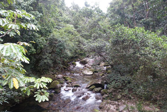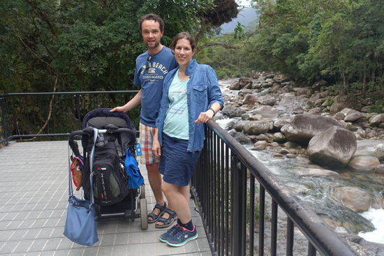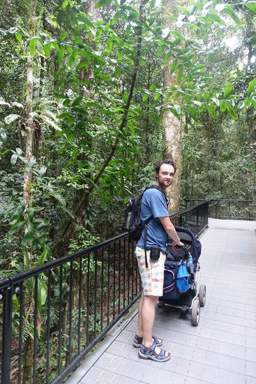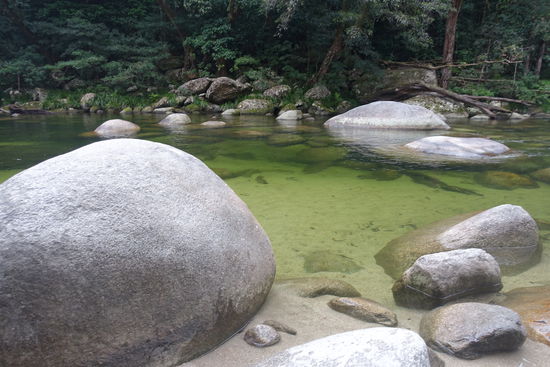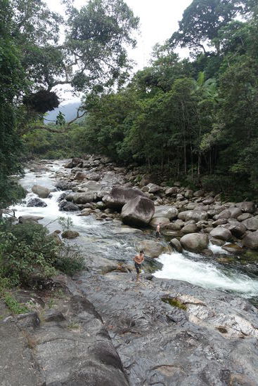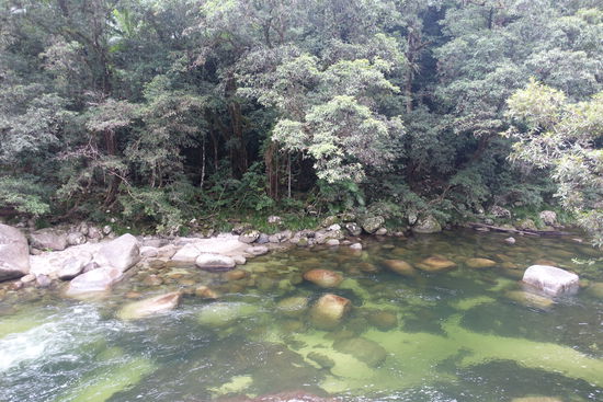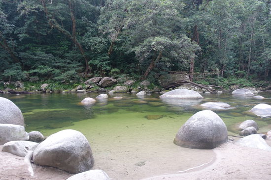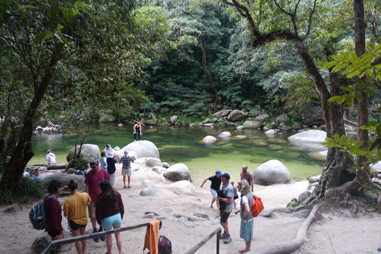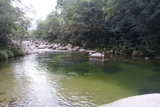 Nachdem wir nach der einstündigen Crocodile Cruise wohlbehalten wieder aus dem Boot ausstiegen, ging es erstmal wieder zum Wohnmobil. Wir suchten uns dann einen Parkplatz direkt am Strand( natürlich sind wir nicht ausgestiegen- nur Lars um das Gas aufzudrehen), um Mittagessen zu machen. Danach ging es wieder etwas südlicher ins 10 km entfernte Mossmann. Der Ort ist vor allem für die Mossmann Gorge bekannt. Eine sehr leicht zugängliche Sektion des Daintree Nationalparks (Wet Tropics Rainforrest). Das Visitor Center machte darauf aufmerksam, dass ein Shuttlebus zur 2 km entfernten Gorge fährt. Vor allem weil zwischen Gorge und Visitor Center eine Aborigines Gemeinde liegt und die Einwohner es nicht gerne sehen, wenn die Touristen in Massen über ihr Land wandern. Direkt an der Gorge war ein sehr gut mit Kinderwagen begehbarer Rundweg durch den Regenwald mit den Aussischtspunkten. Alles sehr einfach zu bewältigen und es waren keine Mücken unterwegs Das Wetter lud uns nicht unbedingt zu einer Erfrischung zwischen den Felsen ein ( bewölkt aber angenehm warm), jedoch eine Menge anderer Leute wollte sich dieses Erlebnis trotz Warnung wegen Strömung nicht entgehen lassen. ( Weißt du noch Sabine 1999? ) Krokodile waren dort aber nicht zu befürchten.