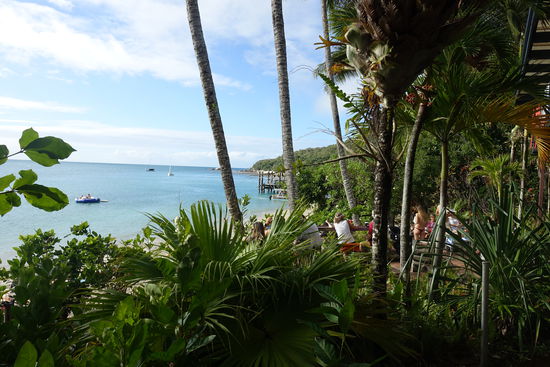 Nachdem wir schon in Palm Cove über die Rezeption des Campingplatzes die beiden Ausflüge zu den Inseln im Great Barrier Reef gebucht hatten, haben wir erst beim Einchecken ins Hotel den Wetterbericht gesehen. Mal wieder hätten wir uns keine schlechteren Tage für die Inseltrips aussuchen können. Zumindest laut der Vorhersage für Cairns. Laut Hotelmitarbeiter stimme das meistens sowieso nicht. Bei uns traf der Wetterbericht dann doch zuverlässig ein. Denn mit Ankunft der Fähre am Anleger ergoss sich ein heftiger Platzregen über der Insel. Gut, dass wir unsere Regenjacken dabei hatten. Alle retteten sich schnell zum Resort, das in der Verlängerung der Anlegestelle lag, um sich schnell unterstellen zu können - eigentlich war der Zutritt nur für Resortgäste. Das war uns aber egal. Hauptsache mit Emil und dem Kinderwagen ins Trockene. Als der Regen irgendwann nach ließ, konnten wir raus und die Insel erkunden, soweit das mit Kinderwagen möglich war. Es war ja schon Mittag und so trieb uns der Hunger zur anliegenden Bar & Grill, wo es die übliche Auswahl an Burgern, Pommes, Sandwiches und Fisch gab.