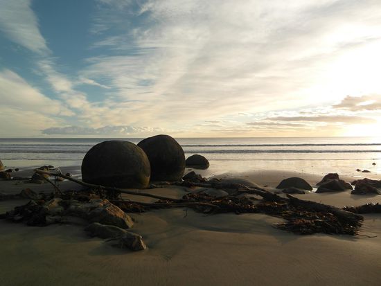Die Maori glaubten, dass die Moeraki Boulders aus dem Kanu eines Gottes gefallen und seitdem an Ort und Stelle geblieben sind. Heute weiß man, dass die tonnenschweren Steine aus Kalzit bestehen und vor über 65 Millionen Jahre geformt wurden. Wie dem auch sei, sie sind wirklich beeindruckend und man muss einfach anhalten, wenn man die Küste entlang fährt.