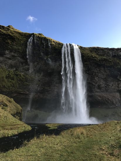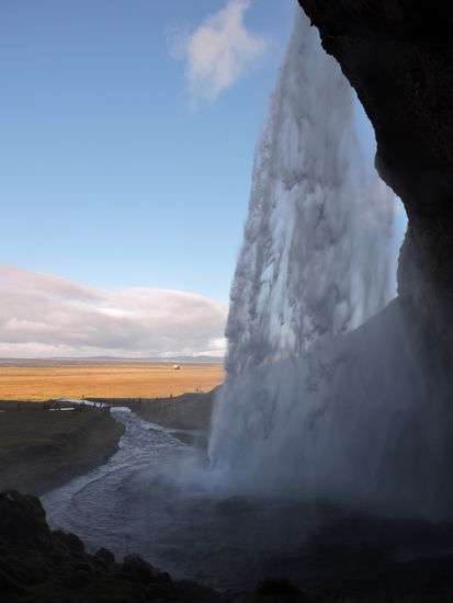 Nach insgesamt ca 2 Stunden erreichte ich den Parkplatz des Seljalandsfoss Wasserfalls. Für das parken musste ich 700 ISK bezahlen, was allerdings eine Ausnahme für Island ist. Wie die meisten anderen Parkplätze ist auch dieser mit mittelgroßen Steinen aufgeschüttet worden und hat einige Schlaglöcher. Auch wenn man ganz langsam fährt hört es sich an, als ob man sich den Lack oder den Unterboden des Autos zerstören würde. Generell können auf Island ganz leicht Schäden an Lack und Scheiben entstehen. Daher ist eine umfangreiche Versicherung tatsächlich empfehlenswert. Aber egal, nun zum Wasserfall. Der Seljalandsfoss stürzt 66m in die Tiefe und man kann über einen schmalen und rutschigen Pfad sogar hinter dem Wasserfall entlanglaufen. wasserfeste Kleidung und rutschfeste Schuhe sind zu empfehlen.