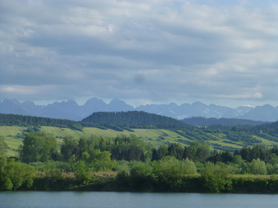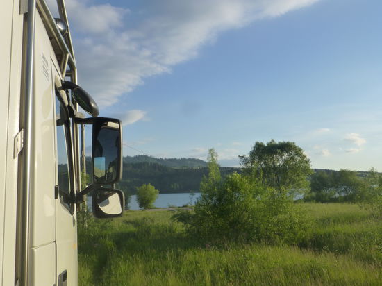 Nach einem stärkenden und vor allem leckeren Mittagsmahl im Hotel Grand Sal geht es nun weiter in Richtung Süden. Wir fahren durch eine wunderbar hügelige Landschaft, die sogenannte "Podhale". Bei Nowy Targ erblicken wir zum ersten Mal die zackige Silhouette der Hohen Tatra, das "kleinste Hochgebirge der Welt". Unser Ziel ist allerdings nicht Zakopane, die touristische Tatra-Hochburg Polens, sondern wir biegen vorher nach Osten ab zum Stausee Jezioro Czorsztynskie. Hier wollen wir uns einen schönen Übernachtungsplatz suchen und werden an einem Wiesengrundstück nicht weit vom Ufer des Sees fündig. Wir können einen wunderbaren Sonnenuntergang mit Blick auf den See genießen. Einer unserer Top-Plätze dieser Reise.