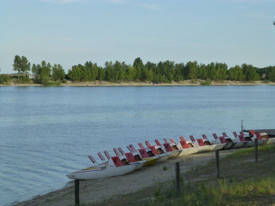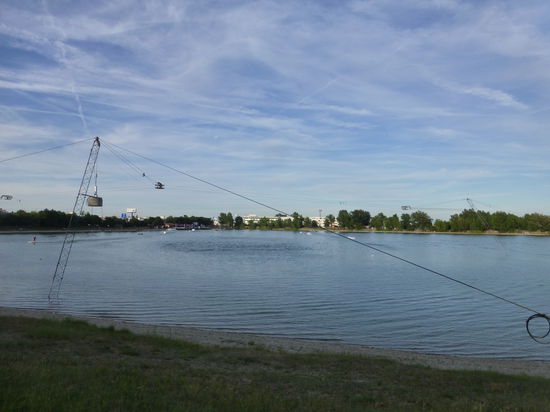 Er liegt an einem Wassersport- und Freizeitzentrum am Flughafensee, wo heute an einem Sommer-Sonntag natürlich der Bär steppt. Der Campingplatz ist soweit in Ordnung, die Tram hält vor der Tür und wir bezahlen 26 Euro für zwei Nächte.
