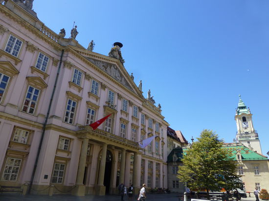 Mit der Tram Nr. 4 kommen wir für 0,90 € in 20 Minuten mitten ins Stadtzentrum von Bratislava. Die Altstadt lässt sich gut zu Fuß an einem Tag erkunden. Geprägt ist sie von prächtigen Palais aus der Habsburger Zeit der Donaumonarchie. Alles ist teilweise erst neu renoviert und strahlt in frischem Glanz. Die Schiffe der Donaukreuzfahrten machen unter anderem hier Halt, doch der Andrang an Touristengruppen hält sich heute in Grenzen.