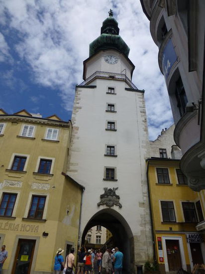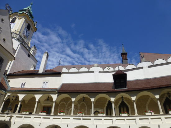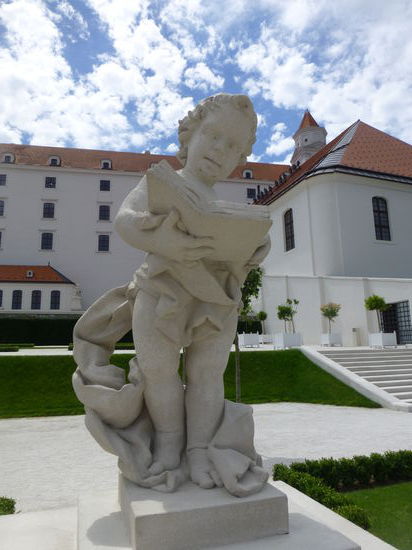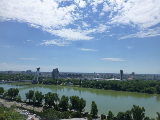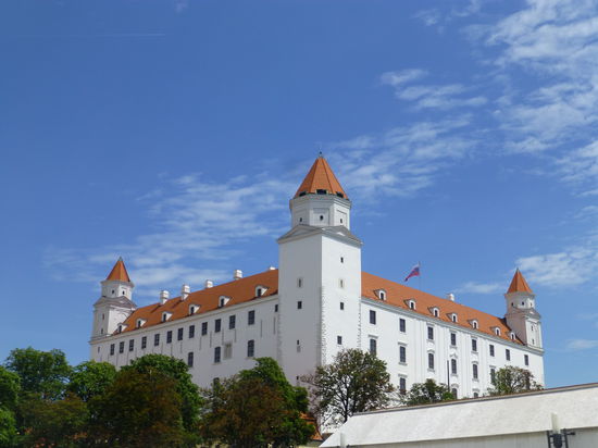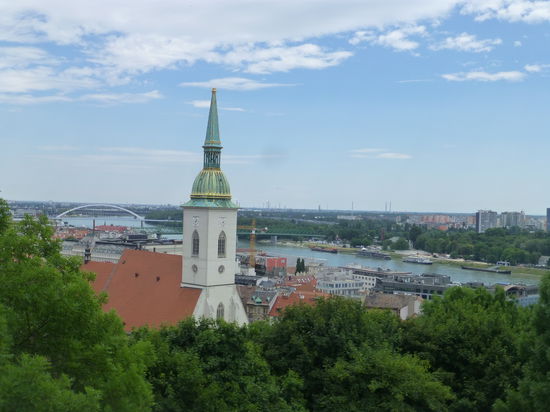 Nach einem Streifzug durch die Altstadt steuern wir die Burg an. Auf dem Hügel über der Donau hat man eine tolle Aussicht auf die Stadt und das im Süden angrenzende Donautiefland. Allerdings wird auch deutlich, dass Bratislava eine Industriestadt mit viel Petrochemie ist. Rauchende Schornsteine und riesige Windparks (die übrigens zu Österreich gehören, wie wir später feststellen) sowie Plattenbauten bestimmen die Kulisse in den Vorstadtgebieten. Die solwakische Regierung hat hier oben ebenfalls ihren Sitz. Wir beschließen eine Kaffeepause im lauschigen und schattigen Biergarten des Burgrestaurants mit Blick auf die Altstadt.