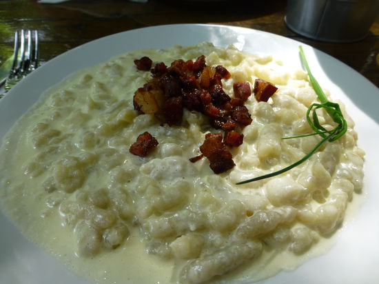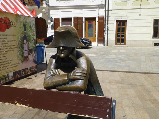 Weiter schlendern wir noch ein wenig durch die Altstadt. Vorbei an Oper, Theater und ein paar von Touristengruppen umlagerten Bronzefiguren, die typisch für Bratislava sind, gibt es an einem Park/Boulevard ein frühes Abendessen. Ich entscheide mich slowakische Käsespätzle (Brimsen mit Schafskäse und Speck). Ganz anders - aber sehr lecker!