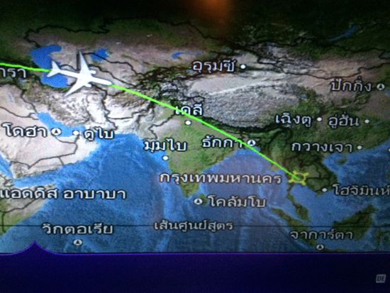 Da unten gibt es jetzt immer mehr Lichter. Kleine Orte, ein paar Lichter, keine Strassen dazwischen, jedenfalls keine, die nachts sichtbar sind. Und jetzt muss da unten wohl ein grosses Tal sein. Die Lichter und Orte ziehen sich entlang einer geschwungenen Linie. Interessant, was man alles bemerkt, wenn man in die Dunkelheit schaut und versucht, sich die Gegend bei Tag vorzustellen. Die Orte werden immer mehr, jetzt gibt es auch beleuchtete Strassen, Hauptverbindungen und dann liegt da unten Delhi, Indien. Eine riesige Stadt, die fast das ganze Blickfeld einnimmt. Auf dem Bildschirm verfolge ich, wo wir inzwischen sind. Noch 4 Stunden bis Bangkok.
