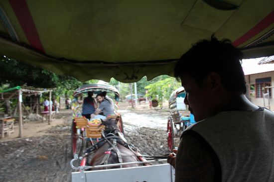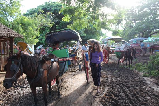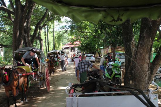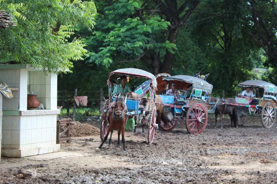 Kutschen erwarten uns im schlammigen Boden bei der Anlagestelle. Und eine ganze Horde Verkäuferinnen, die Halsketten aus Jade verkaufen.