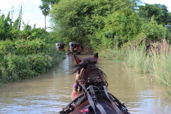 Wir fahren durch den Matsch des letzten Regens in Wasserlöcher und plötzlich werden die Wasserlachen zu einem kleinen See. Mir kommt das ganze schon fast wie ein Treck in den Wilden Westen vor. Die Räder der Kutschen wackeln bedenklich in den Achsen, die Pferde stapfen durch knietiefes Wasser und die Verkäuferinnen folgen uns nicht mehr, das Wasser ist zu tief. Dafür schwimmt ein Hund mit, watet gelegentlich an den Rand und schüttelt sich, doch dann kehrt er um ins Wasser, folgt der Kutsche vor mir.