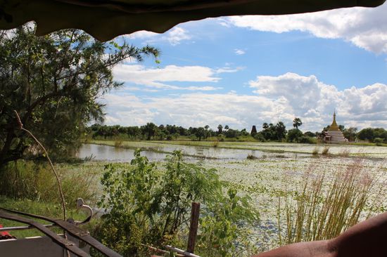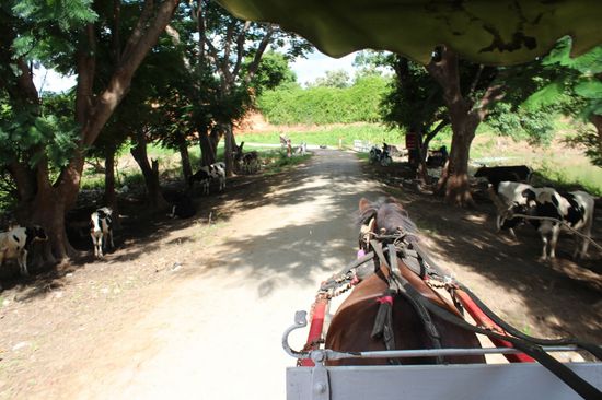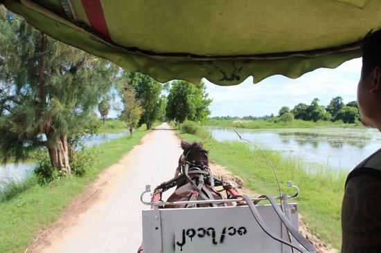 Die Fahrt mit der Kutsche geht weiter. Entlang von Reisfeldern, vorbei an stillen Weihern.