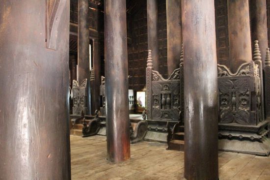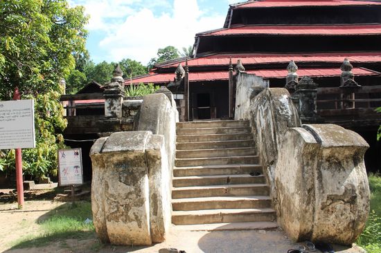 Die nächste Pagode ist eine Überraschung. Eine Pagode ganz aus Teakholz gebaut. Die Schuhe werden wie üblich vor dem Eingang gelassen und dann geht es barfuss über die steinerne Treppe hinauf zum Tempel.