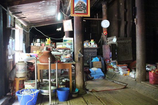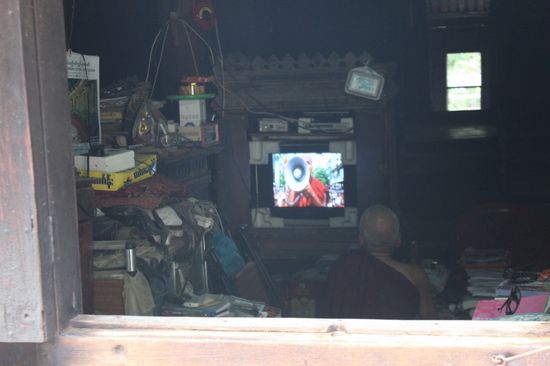 Jedenfalls eine sehr erstaunliche Anlage. Und fast unverwüstlich. Ganz hinten entdecke ich in einer Ecke etwas wie eine Schule mit Holzbänken und Pulten. Dahinter wohnt offensichtlich ein Mönch. Inmitten von Büchern und überstellten Möbeln hat er sich eine Ecke eingerichtet. Er lässt sich nicht stören, starrt unentwegt in einen Schrank. Vielleicht meditiert er.