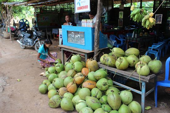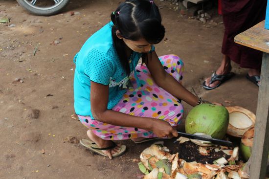 Und dort entdecke ich den Imbisstand, wo frische Kokosnuss verkauft wird. Hier komme ich mit Degi und Eric ins Gespräch. Degi kommt aus Ghana und arbeitet seit kurzem in Yangon. Eric ist auf Besuch und zusammen erkunden sie für eine Woche Myanmar.
