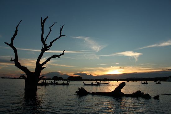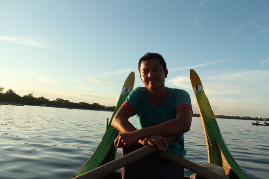Schon am Morgen sind mir die eigenartigen Boote aufgefallen und ich hatte mir das für den Abend vorgenommen. Wir mieten also ein Ruderboot und lassen uns auf den See hinaus fahren. Das ist bedeutend ruhiger, als sich durch die Menschenmengen zu kämpfen.