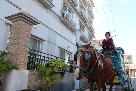 Aber bevor wir zum Wasserfall aufbrechen, zeigt er mir noch einmal ein paar Herrschaftshäuser. Im-mer wieder hält er an, steigt vom hohen Bock und erklärt mir, was ich hier sehe. Am Morgen bin ich selber hinauf geklettert, das war gar nicht so einfach, und ich staune, wie schnell er jeweils oben und wieder unten ist.