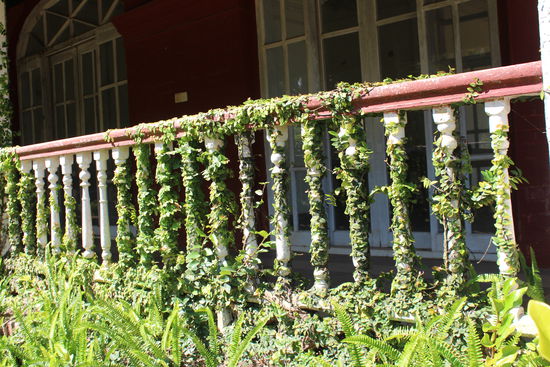 Es sieht verwunschen aus. Passt zu meiner Cindarella-Kutsche, erinnert zwar eher an Dornröschen, denn langsam wird das Mauerwerk und die Balkone von Pflanzen überwuchert. Im Rosengarten gibt es einen tiefen Brunnen, wo der Frosch-könig leben könnte. Durch die Eingangstüre entdecke ich eine geschwungene Treppe die fast die gan-ze Halle einnimmt und in zwei grossen Bogen hinauf zum zweiten Stock reicht. Neben dem Haus gibt es einen Tennisplatz, der allerdings schon längst nicht mehr bespielt wurde. Der Besitzer ist längst weggezogen.