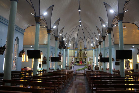 Die Kirche ist geschlossen, aber dahinter treffe ich auf eine Nonne. Sie spricht zwar kein Wort Eng-lisch, aber sie holt den Schlüssel und schliesst die Türe auf, lässt mich einen Blick ins Innere werfen. Sie ist ganz ähnlich aufgebaut wie die gestern, aber sie hat spitze breite Bogen. Ein stilistisches Gemisch.