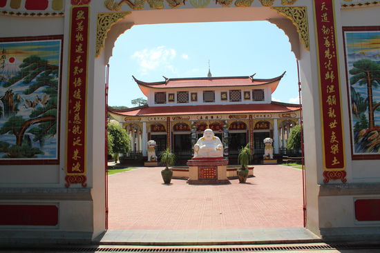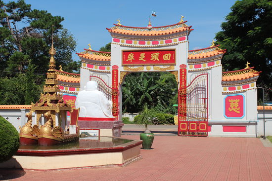 Der nächste Halt ist vor einem chinesischen Tor. Ein dicker weisser Buddha sitzt in einem einem gepflegten kleinen Park und dahinter gibt es einen grossen chinesischen Tempel. Ich schlendere durch die Anlage und steige auf den Aussichtsturm. Hier hat man einen weiten Blick über das ganze Gelände. Beim Abstieg kommt mir eine einheimische Familie entgegen. Als sie meine Kamera sehen, möchten sie, dass ich sie fotografiere. Auch sie wollen mit ihren Handys eine Foto von mir machen. So kommen wir also alle zusammen zu einem fröhlichen Fotoshooting.