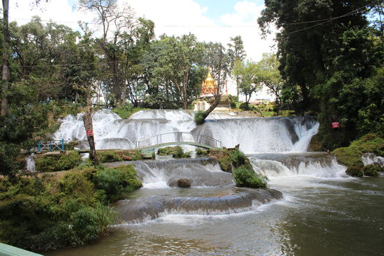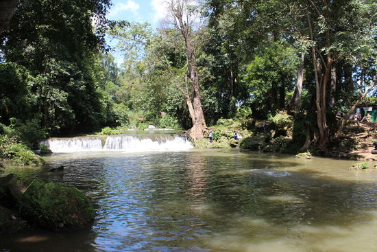 Zuerst bin ich enttäuscht, dieser kleine Wasserfall mit dem Becken, in dem sich ein paar Einheimische tummeln, war die Mühe nicht wert. Doch dann entdecke ich auf der anderen Seite der Holzbrücke, dass hier noch ein paar Attraktionen geboten werden.