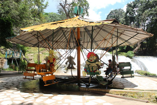 Hier am Wasserfall ist alles da für einen gemütlichen Nachmittag. Es gibt ein paar Einkaufsstände fürs Shopping, Verpflegungsmöglichkeiten, den kleinen Klettergarten, das Karussell.
